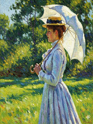 PROMPT: “crea liberamente un’immagine che rappresenti ‘Essai de figure en plein-air: Femme à l’ombrelle tournée vers la gauche’, il celebre dipinto del pittore francese Claude Monet, realizzato nel 1886 e conservato al Musée d’Orsay di Parigi.”